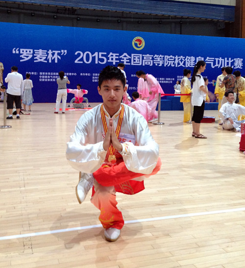 7月21日至23日,2015年全国高等院校健身气功比赛在安徽池州举行。国际学院“功夫小子”马来西亚籍学生2014级中医学专业的林元凯同学代表学校参与比赛,并斩获“健身气功·易筋经男子个人项目第一名的佳绩!为学校争光,学院添彩!