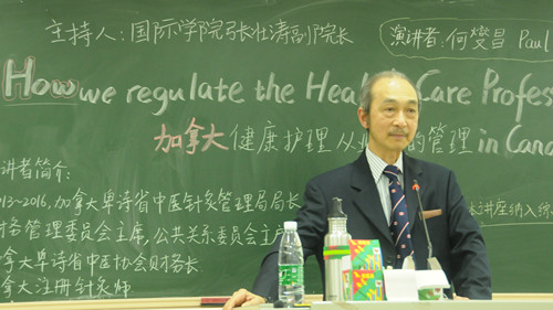 为帮助学生了解加拿大健康护理从业人员管理和相关健康护理的知识,2014年4月25日晚上7点,我院邀请了加拿大卑诗省中医针灸管理局局长何燮昌 (Paul Ho)教授做了题为“加拿大健康护理从业人员的管理”的全英讲座。讲座由国际学院副院长张壮涛主持。