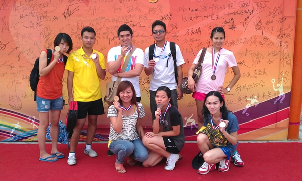 在羽毛球比赛中, 我校阮得俊英(越南)、李易飞(泰国)、 陈森海(印尼)分别获得男子单打比赛第五、六、七名;李易飞(泰国)、 陈森海(印尼)获得男子双打比赛第六名;黄红(泰国)、杜氏映月(越南)分别获得女子单打比赛第四、 五名。