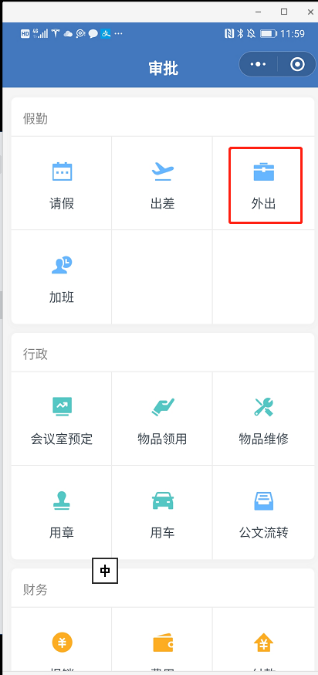 第二步:在【审批】页面的假勤中选择【外出】。