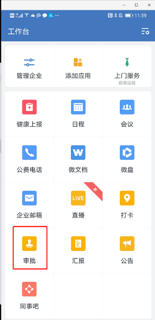第一步:打开APP首页,在【工作台】页面找到【审批】,点击进入审批页面。