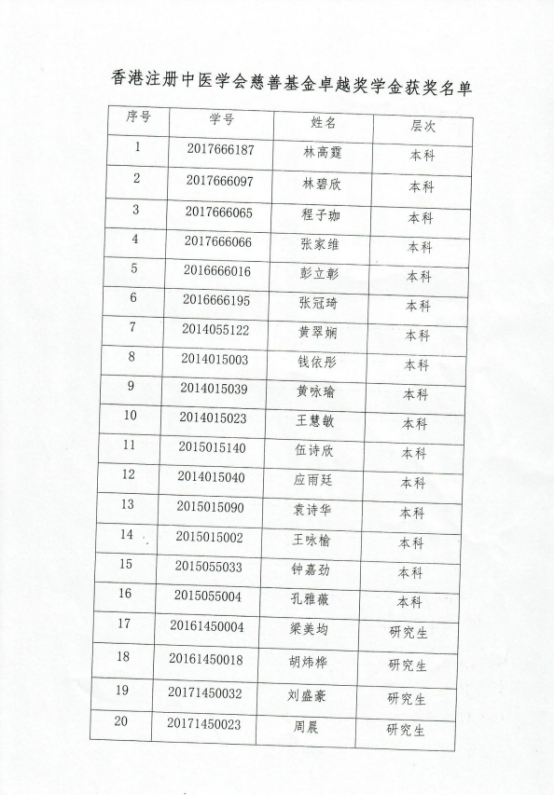 根据《437ccm·必赢国际设立香港注册中医学会慈善基金卓越奖学金捐赠协议书》以及《437ccm·必赢国际做好“香港注册中医学会慈善基金車越奖学金的通知”评选的通知》精神,经学生个人申请、学校评审及捐赠方审核,共评选出20位香港学生(其中本科生16名,研究生4名)荣获此项奖励,毎人奖励人民币5000元,奖金金额合计人民币100,000元。发放名单见下。奖学金一次性发放至学生本人的中国银行卡中。