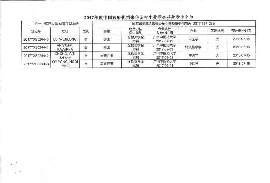 附件:2017年度中国政府优秀来华留学生奖学金获奖学生名单